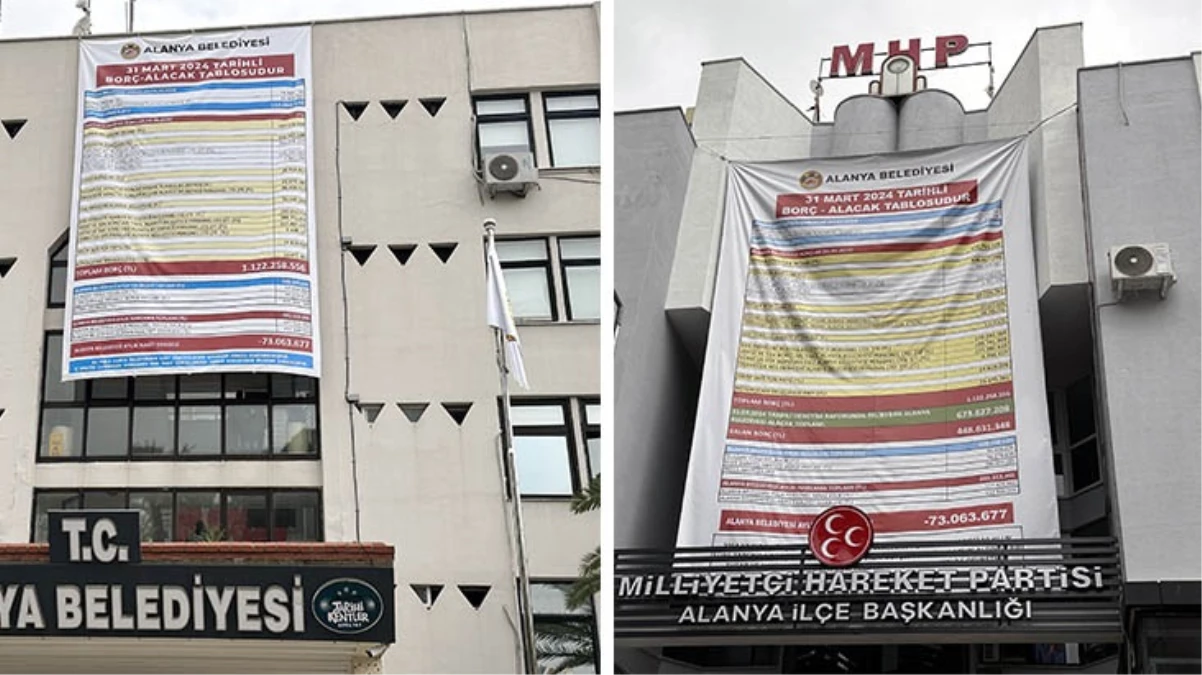 Alanya Belediyesi'ne asılan afişe MHP İlçe Başkanlığı'ndan da afişli karşılık geldi. MHP ilçe binasına asılan afişte ise belediyenin toplam borcu 1 milyar 122 milyon 258 bin 556 lirayken, toplam alacağının 673 milyon 627 bin 208 lira olduğu ve bu durumda toplam borcunun 448 milyon 631 bin 348 lira olduğu vurgulandı.