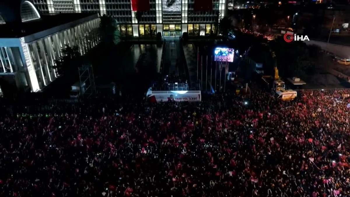 Bir kez daha İstanbul Büyükşehir Belediye Başkanı seçilen Ekrem İmamoğlu, CHP İstanbul İl Başkanı Özgür Çelik ile birlikte seçim otobüsünün üzerinden coşkulu kalabalığı selamladı. İmamoğlu'na, eşi Dr. Dilek Kaya İmamoğlu, oğulları Selim ve Semih ile kızları Beren İmamoğlu da eşlik etti. Vatandaşların isteği üzerine ceketini çıkarıp, gömleğinin kollarını sıvayan İmamoğlu, konuşmasında şunları söyledi: