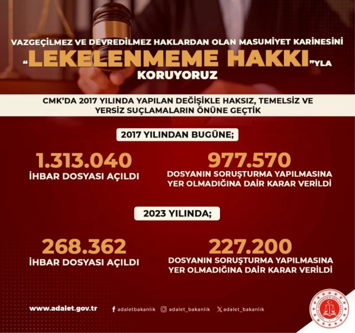 Lekelenmeme hakkı konusunda Ceza Muhakemesi Kanununun 158. maddesinde yapılan değişiklik sonrasında 2017 yılından bugüne kadar toplam 1 milyon 313 bin 40 ihbar dosyası açıldı ve bu dosyalardan 977 bin 570'inde soruşturma yapılmasına yer olmadığına dair karar verildi.