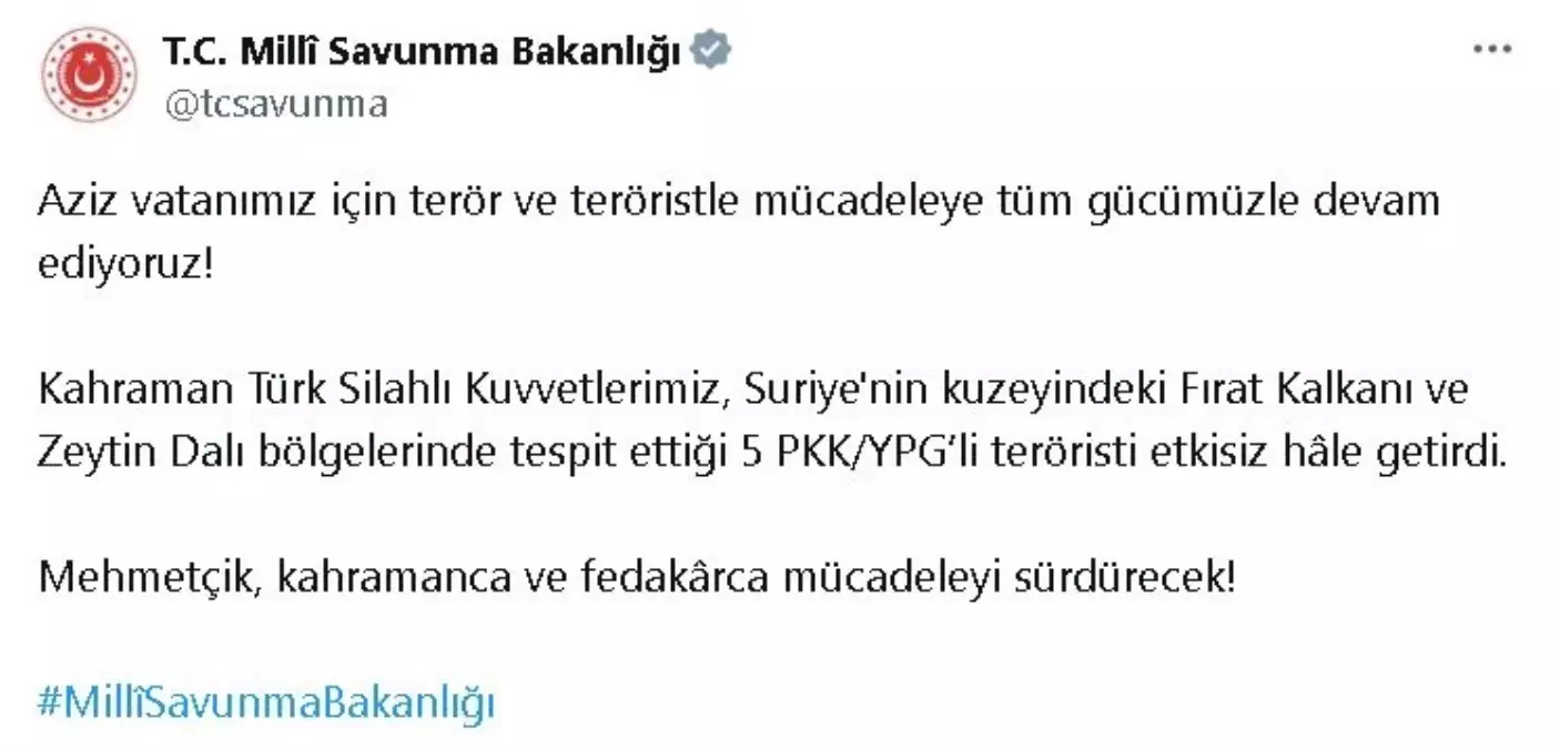 Bakanlığın sosyal medya hesabından yapılan açıklamada, "Aziz vatanımız için terör ve teröristle mücadeleye tüm gücümüzle devam ediyoruz. Kahraman Türk Silahlı Kuvvetlerimiz, Suriye'nin kuzeyindeki Fırat Kalkanı ve Zeytin Dalı bölgelerinde tespit ettiği 5 PKK/YPG'li teröristi etkisiz hale getirdi. Mehmetçik, kahramanca ve fedakarca mücadeleyi sürdürecek" denildi.