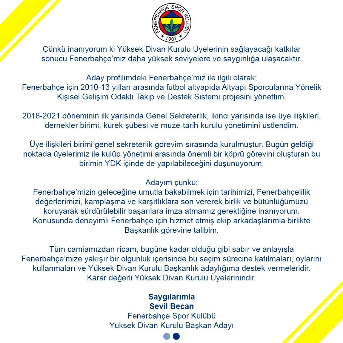 Çünkü inanıyorum ki Yüksek Divan Kurulu Üyelerinin sağlayacağı katkılar sonucu Fenerbahçe'miz daha yüksek seviyelere ve saygınlığa ulaşacaktır. Aday profilimdeki Fenerbahçe'miz ile ilgili olarak; Fenerbahçe için 2010-13 yılları arasında futbol altyapıda Altyapı Sporcularına Yönelik Kişisel Gelişim Odaklı Takip ve Destek Sistemi projesini yönettim. 2018-2021 döneminin ilk yarısında Genel Sekreterlik, ikinci yarısında ise üye ilişkileri, dernekler birimi, kürek şubesi ve müze-tarih kurulu yönetimini üstlendim. Üye ilişkileri birimi genel sekreterlik görevim sırasında kurulmuştur. Bugün geldiği noktada üyelerimiz ile kulüp yönetimi arasında önemli bir köprü görevini oluşturan bu birimin YDK içinde de yapılabileceğini düşünüyorum. Adayım çünkü; Fenerbahçe'mizin geleceğine umutla bakabilmek için tarihimizi, Fenerbahçelilik değerlerimizi, kamplaşma ve karşıtlıklara son vererek birlik ve bütünlüğümüzü koruyarak sürdürülebilir başarılara imza atmamız gerektiğine inanıyorum. Konusunda deneyimli Fenerbahçe için hizmet etmiş ekip arkadaşlarımla birlikte Başkanlık görevine talibim. Tüm camiamızdan ricam, bugüne kadar olduğu gibi sabır ve anlayışla Fenerbahçe'mize yakışır bir olgunluk içerisinde bu seçim sürecine katılmaları, oylarını kullanmaları ve Yüksek Divan Kurulu Başkanlık adaylığıma destek vermeleridir. Karar değerli Yüksek Divan Kurulu Üyelerinindir." - İSTANBUL