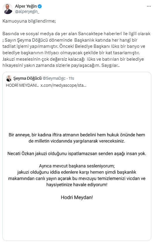 Döğücü’nün çağrı yaptığı yeni Sancaktepe Belediye Başkanı Alper Yeğin’den de yanıt gecikmedi. Sosyal medya hesabından açıklama yapan Yeğin, “Basında ve sosyal medya da yer alan Sancaktepe haberleri ile ilgili olarak; Sayın Şeyma Döğücü dönemindeBaşkanlık katında herhangi bir tadilat işlemi yapılmamıştır. Önceki Belediye Başkanı lüks bir banyo ve belediye başkanının ihtiyacı olmayacak şekilde bir kat tasarlamıştır. Jakuzi meselesinin çok değersiz kalacağılüks ve batırılan bir belediye hikayesini yakın zamanda sizlerle paylaşacağım” dedi.