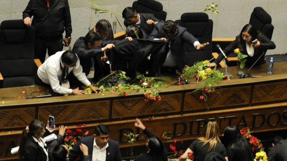Meclis kürsüsüne çıkan Devlet Başkan Yardımcısı David Choquehuanca’ya domates fırlatılmasının üzerine Choquehuanca, konuşmasını yapamadan kürsüden inmek ve meclisten ayrılmak zorunda kaldı.