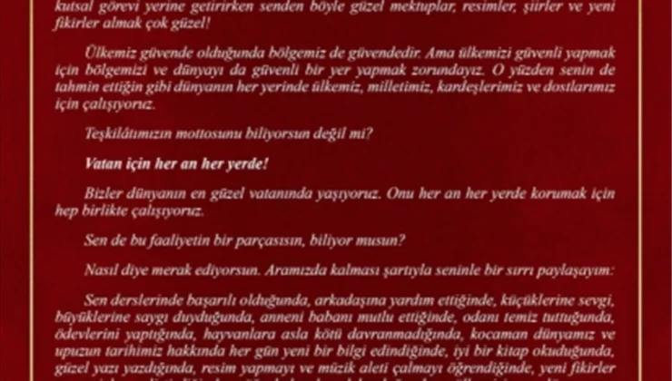 Ben ve teşkilatta çalışan tüm arkadaşlarım senin, anne ve babanın, ailenin, arkadaşlarının, okulunun, köyünün, şehrinin ve ülkemizin güvenliği için buradayız. Ülkemizi her türlü tehlikeye karşı korumak için gece gündüz demeden çalışıyoruz. Bu kutsal görevi yerine getirirken senden böyle güzel mektuplar, resimler, şiirler ve yeni fikirler almak çok güzel.”