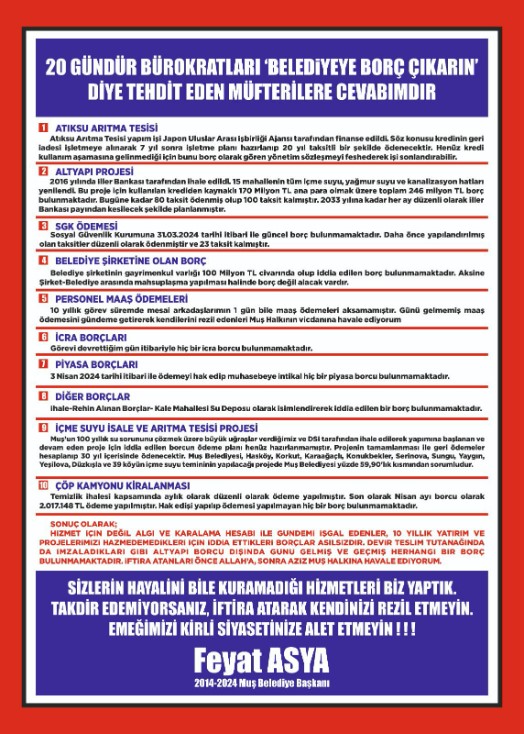 Sonuç olarak; hizmet için değil ve algı ve karalama hesabı ile gündemi işgal edenler, 10 yıllık yatırım ve projelerimizi hazmedemedikleri için iddia ettikleri borçlar asılsızdır. Devir teslim tutanağında da imzaladıkları gibi altyapı borcu dışında günü gelmiş ve geçmiş herhangi bir borç bulunmamaktadır. İftira atanları önce Allah’a, sonra aziz Muş halkına havale ediyorum.