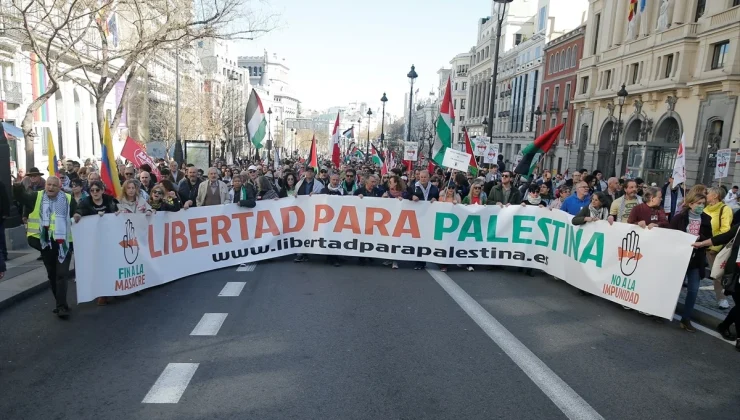 İspanya’da sol görüşlü partiler, sendikalar ve sivil toplum örgütlerinin çağrısıyla, aralarında bakanların da olduğu binlerce kişi Filistin’e destek için gösteri yaptı.