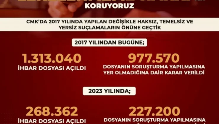 2023 yılında ise 268 bin 362 ihbar dosyası açıldı ve bu dosyalardan 227 bin 200’ünde soruşturma yapılmasına yer olmadığına dair karar verildi.