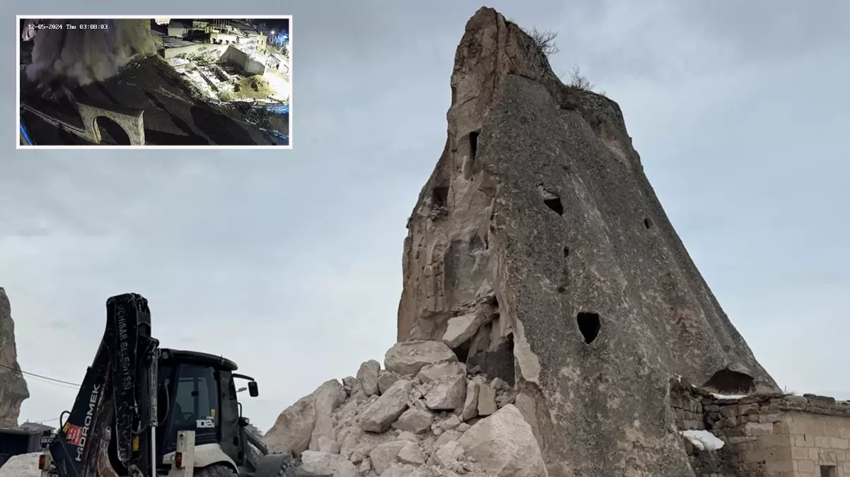 Beldedeki bir otelin yakınında yer alan peribacasında yaşanan çökme, çevredeki güvenlik kamerasınca kaydedildi. Uçhisar Belediyesi ekipleri, kopan kaya parçalarını iş makinesi yardımıyla kaldırarak alanda temizlik çalışması yaptı.