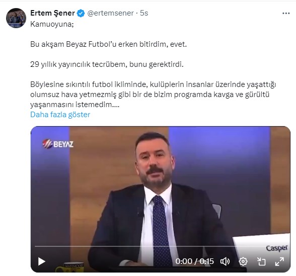 Şener, “Kamuoyuna; Bu akşam Beyaz Futbol’u erken bitirdim, evet. 29 yıllık yayıncılık tecrübem, bunu gerektirdi. Böylesine sıkıntılı futbol ikliminde, kulüplerin insanlar üzerinde yaşattığı olumsuz hava yetmezmiş gibi bir de bizim programda kavga ve gürültü yaşanmasını istemedim. Reyting için programa devam eder ve 1 saat kavga edilmesine izin vermeyi de bilirdim. Yarın da “oh reytingin kralını aldım” derdim. Ama bu sefer futbolu kaosa sürükleyenlerin ekmeğine yağ sürmüş olurdum. Lakin bundan sonra da buna sebep olan kavgacıları eleştirmeye hakkım, hiç olmazdı. Ben, futbolda barış, sükunet ve huzurdan yanayım. Fırsatı reytinge çevirmek, benim programcılık anlayışımda, “özellikle böyle bir dönemde olmaz, olamaz.” dedi.
