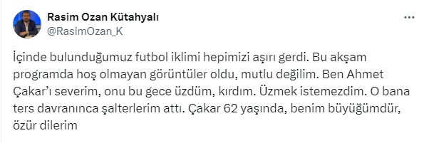 Rasim Ozan Kütahyalı ise yaşananların ardından Ahmet Çakar’dan özür dilediğini açıklayarak, “İçinde bulunduğumuz futbol iklimi hepimizi aşırı gerdi. Bu akşam programda hoş olmayan görüntüler oldu, mutlu değilim. Ben Ahmet Çakar’ı severim, onu bu gece üzdüm, kırdım. Üzmek istemezdim. O bana ters davranınca şalterlerim attı. Çakar 62 yaşında, benim büyüğümdür, özür dilerim.” dedi.