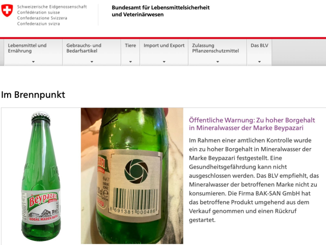 İsviçre Federal Gıda Güvenliği ve Veterinerlik Bürosu, Türkiye’den gelen Beypazarı markasına ait maden suyunda yüksek miktarda bor bulunduğunu açıkladı. İsviçre hükümeti ise Beypazarı marka maden suyunun tüketilmemesi gerektiğini duyurdu ve ürünü yasakladı.