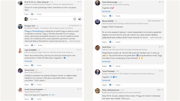 Bu başarının ardından Togg CEO’su Gürcan Karakaş, Linkedin hesabı üzerinden bir paylaşım yaptı ve şunları söyledi: