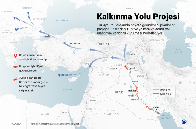 Türkiye’yi Basra Körfezi’ndeki Faw Limanı’na bağlayacak olan Kalkınma Yolu Projesi, ‘Yeni İpek Yolu’ olarak tanımlanıyor. Projenin getirisi ise 20 milyar dolar olması hedefleniyor. Kalkınma Yolu Projesi’nin ilk ayağı olan liman, aynı zamanda Fırat ve Dicle nehirlerinin denize dökülmeden önce birleştiği Şattülarap’ın ağzında yer alıyor. Limandan başlayarak Divaniye, Necef, Kerbela, Bağdat ve Musul’dan geçerek Türkiye sınırına uzanacak demir yolu ve kara yolu hatlarını ihtiva eden projenin, Türkiye sınırından Mersin Limanı’na erişim sağlaması ve karayoluyla İstanbul üzerinden Avrupa’ya ulaşması öngörülüyor.