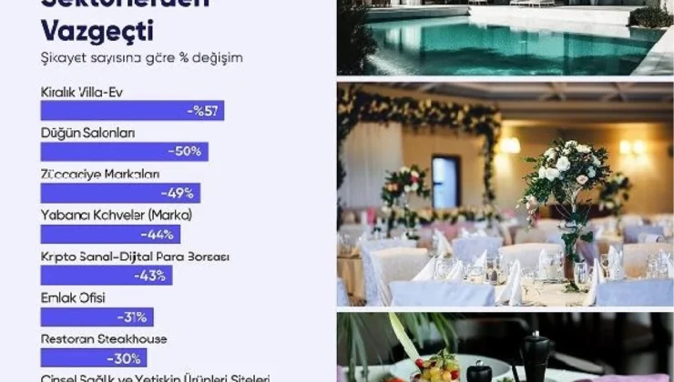 2023’te Türkiye’nin ekonomik ve sosyal koşulları gereği birçok alanda değişim yaşandı. Verilere göre geçtiğimiz yıllar ile kıyaslandığında yüzde 57’lik bir düşüşle şikayetlerin en çok azaldığı sektör kiralık ve villa sektörü oldu. Artan masrafların bir yansıması olarak düğün salonu şikayetleri yüzde 50 azaldı.