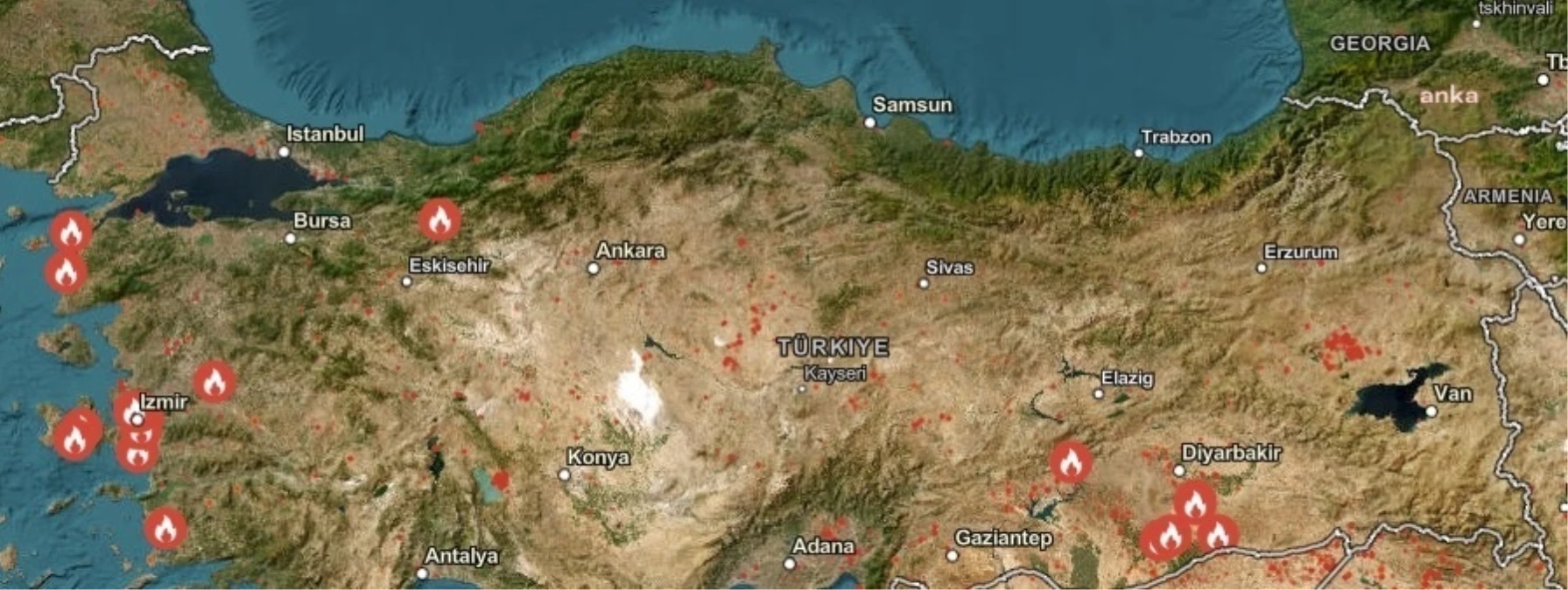(ANKARA)– Türkiye geceyi orman yangınlarıyla geçirdi. NASA Yangın Haritası verilerine göre İzmir’de 941, Manisa’da bin 498 ve Bolu’da iki bin 580 hektar alan yangından etkilendi.