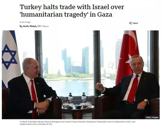 BBC de iki ülke arasındaki ticaretin geçtiğimiz yıl neredeyse 7 milyar dolar değerinde olduğuna dikkat çekti ve Cumhurbaşkanı Erdoğan’ın İsrail saldırılarının başladığı 7 Ekim’den bu yana Tel Aviv yönetimini sert sözlerle eleştirdiğini hatırlattı.
