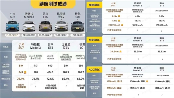 Xiaomi SU7 modeli özellikle 0-100 km hızlanma testinde rakiplerini geride bırakmayı başardı. Buna göre Tesla Model 3 rakibi model 3,24 saniyede 100 km hıza ulaştı. NIO ET5 modeli 3,83 saniye ile ikinci, Tesla Model 3 ise 4,62 saniye ile üçüncü sırada yer aldı.